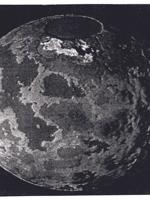 The cover photographs of Mars were taken in 1909 and 1902 and appeared in books by George Camow and Marshall B. Gardner. The protruding polar brightness was explained by Gamow as an ice cap, and by Gardner as the light of an internal sun shining through a polar hole.